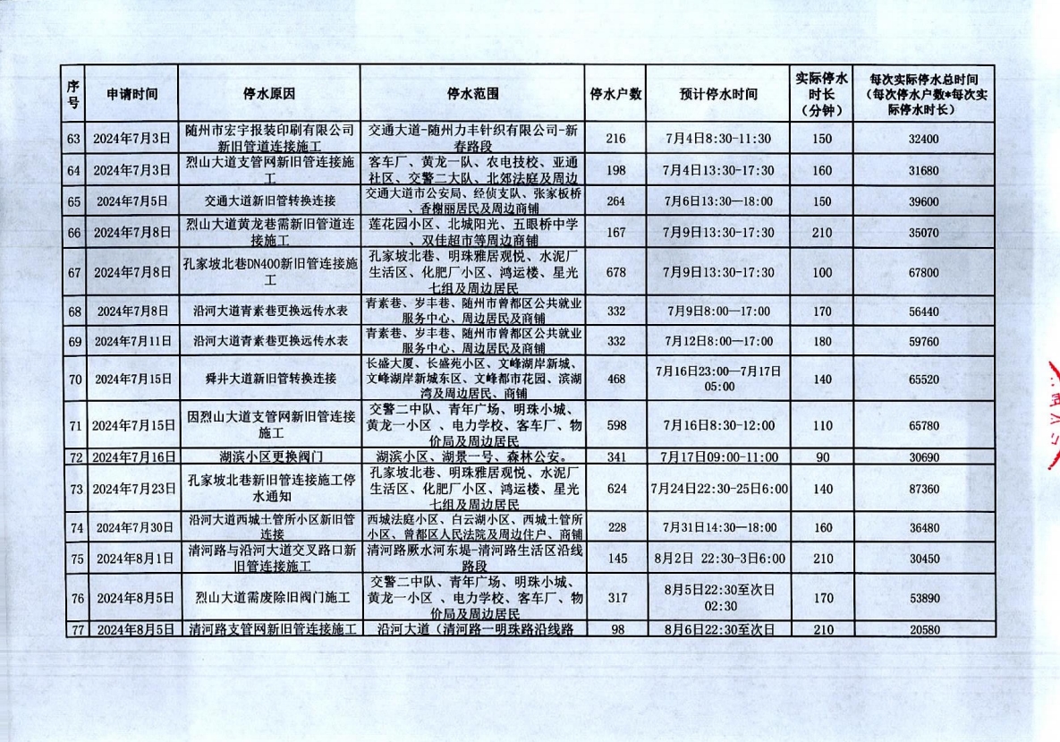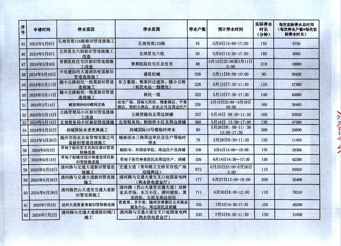 隨州市曾都區(qū)2023年9月至2024年8月計劃性停水資料