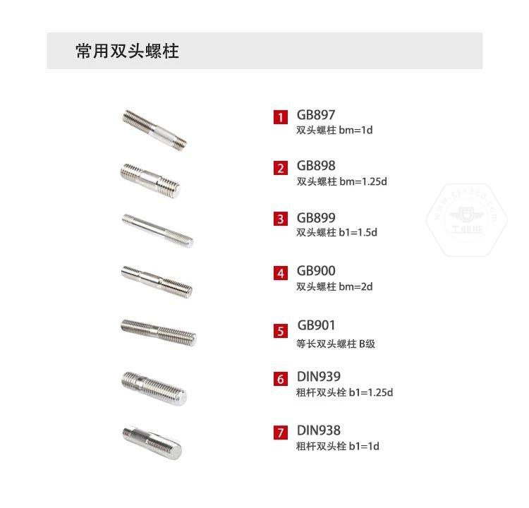 B級等長雙頭螺柱引用國家標準GB901-88,規(guī)定了螺紋直徑為M2-M56、B級的等長雙頭螺柱。