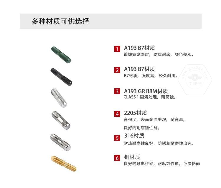 3、常用的雙頭螺柱材質(zhì):35鋼、45鋼、30CrMo、35CrMo、42CrMo、25Cr2MoV、660、304、316、304L316L、B7、B7M、B16、B8、B8M、A320L7、2205/2507等材質(zhì)。