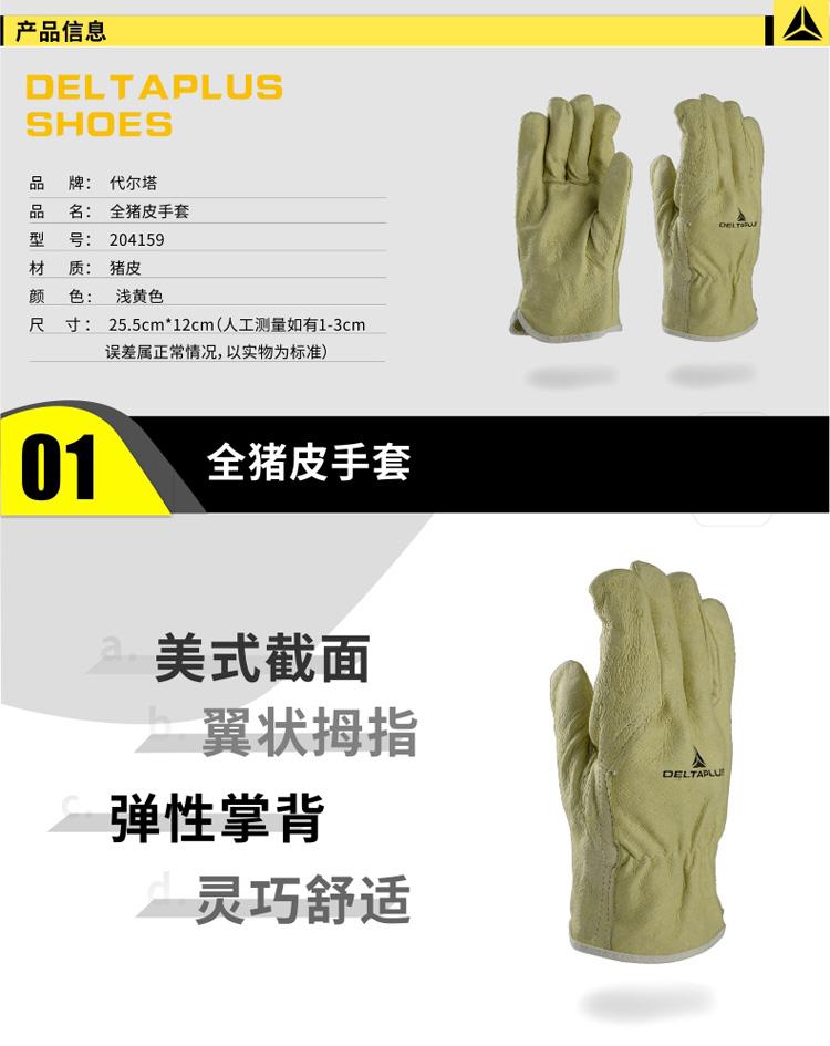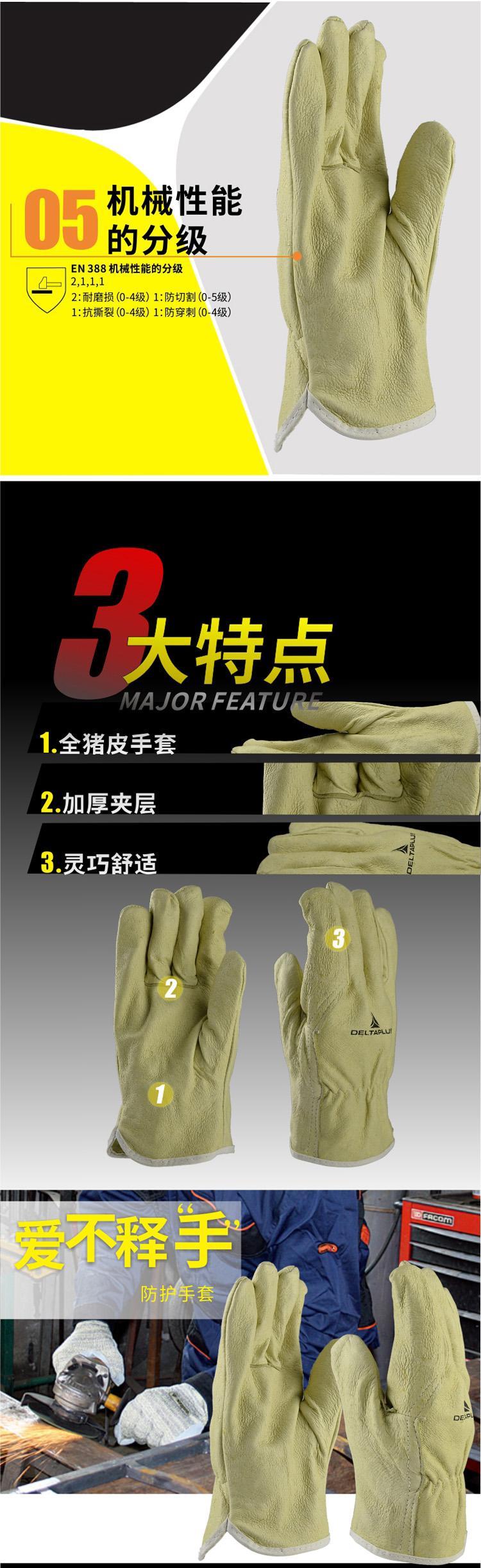 商品名稱:代爾塔 全豬皮搬運(yùn)勞保手套 耐磨透氣靈巧安.全手套 機(jī)械加工修理造船204159 淺黃色9#