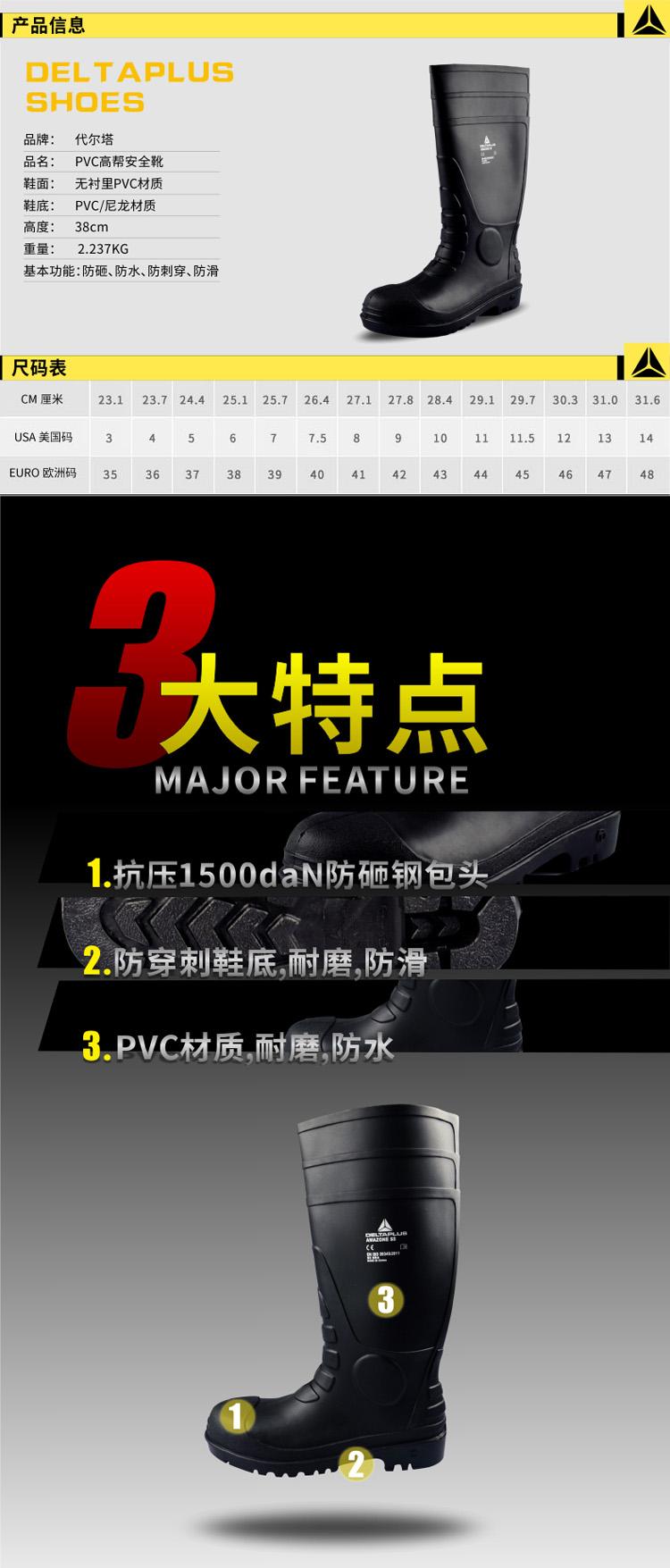 商品名稱:代爾塔 勞保鞋雨鞋 高幫安.全鞋 耐酸堿 PVC防水防滑雨靴 防砸防穿刺 301407 黑色