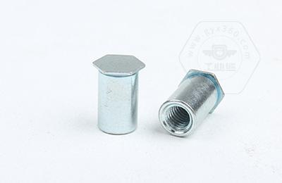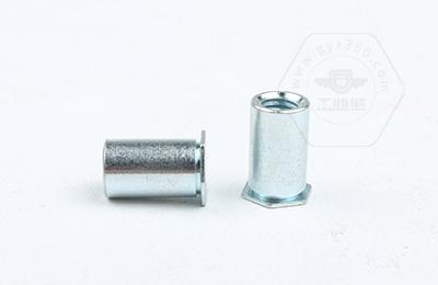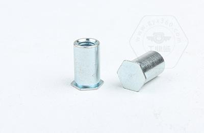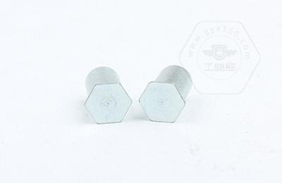 通過壓力機將六角頭壓入薄板的預置孔內(nèi)(預置孔的孔徑一般略大于壓鉚螺柱的圓柱外徑)使孔的周邊產(chǎn)生塑性變形,變形部分被擠入壓鉚螺母柱的退刀槽內(nèi),使壓鉚螺母柱鉚緊于薄板上,從而在薄板上形成一下有效固定的內(nèi)螺紋。